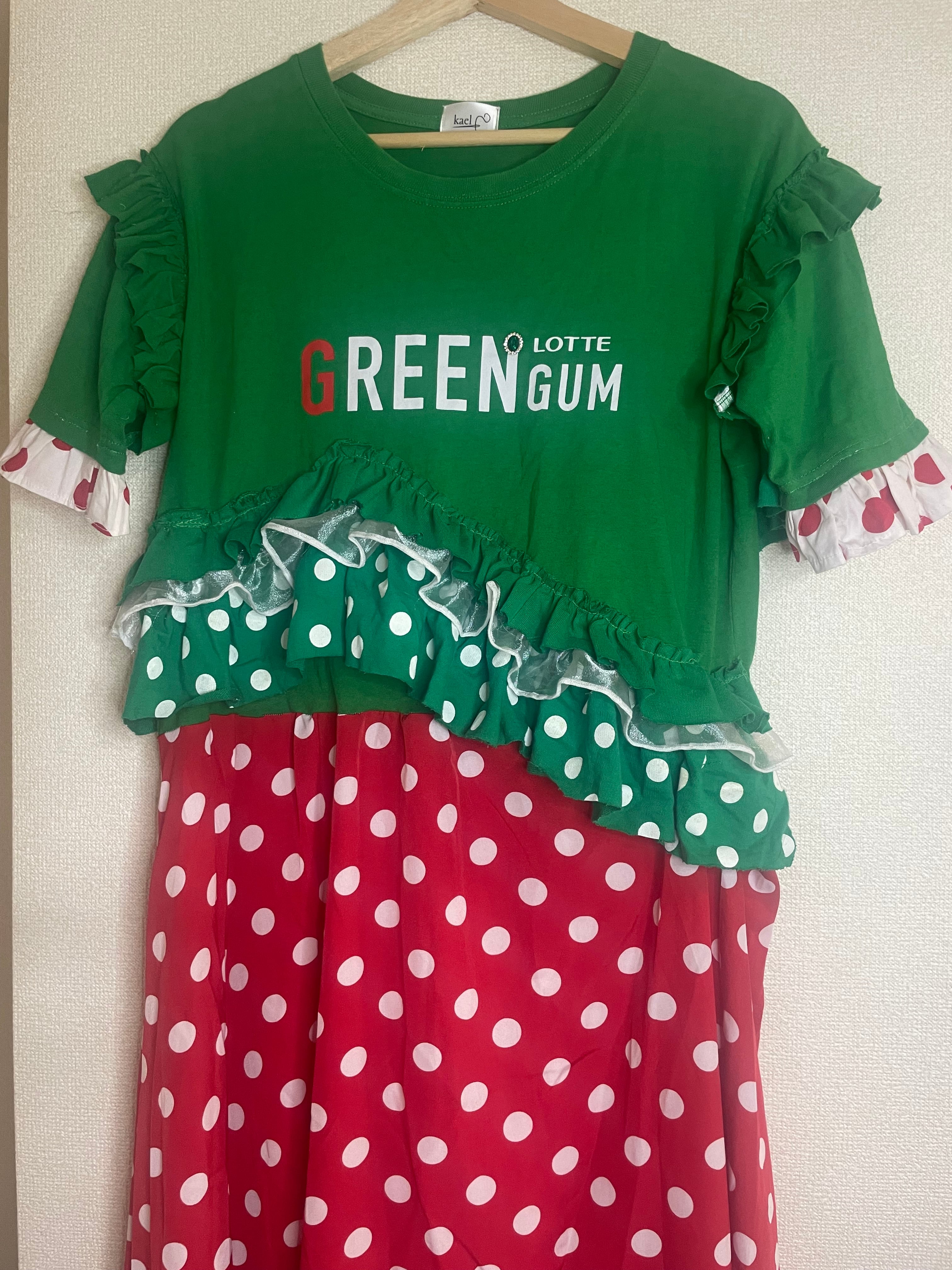 お菓子のTシャツとドット柄の生地が融合したワンピース