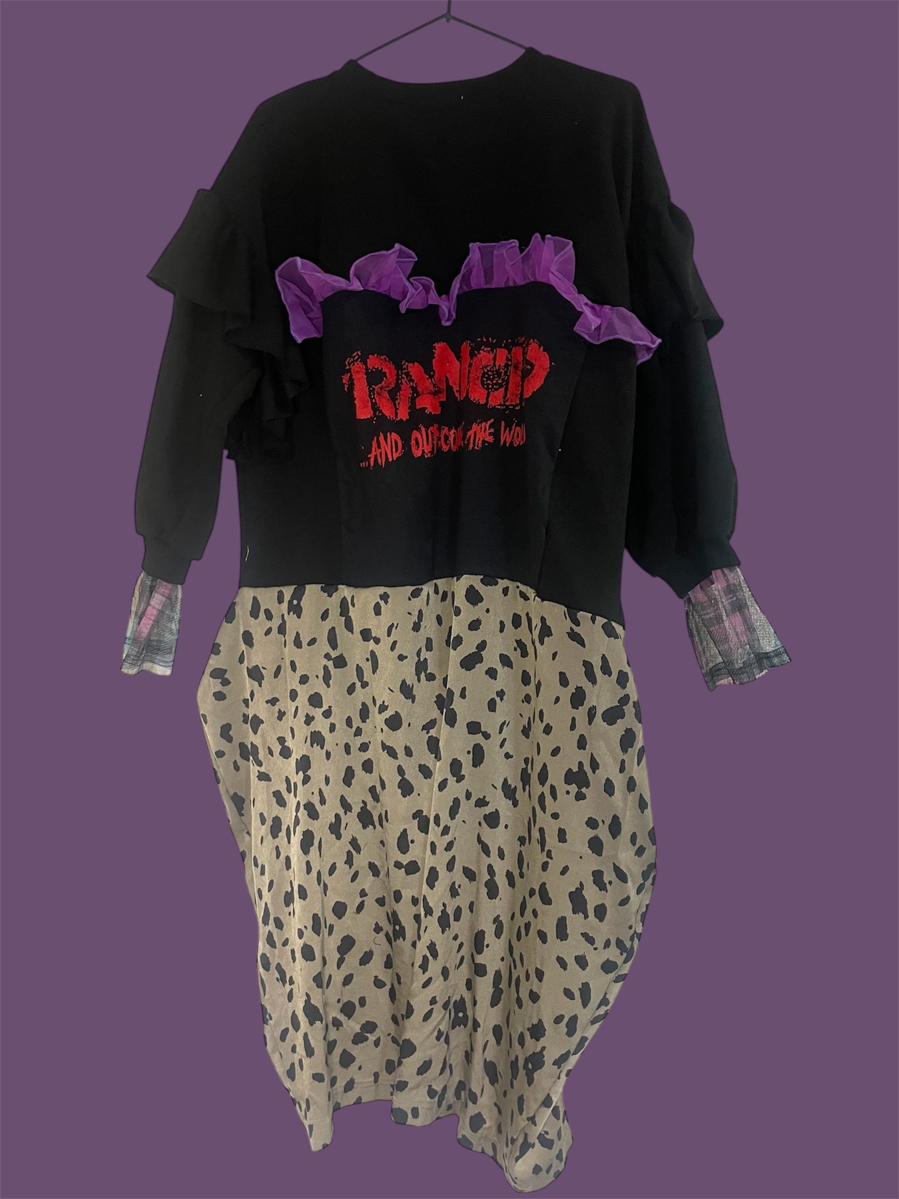 バンドTシャツとトレーナーを大胆にドッキングしたトップスに、レオパードバルーンスカートを組み合わせたパンクガールスタイル。