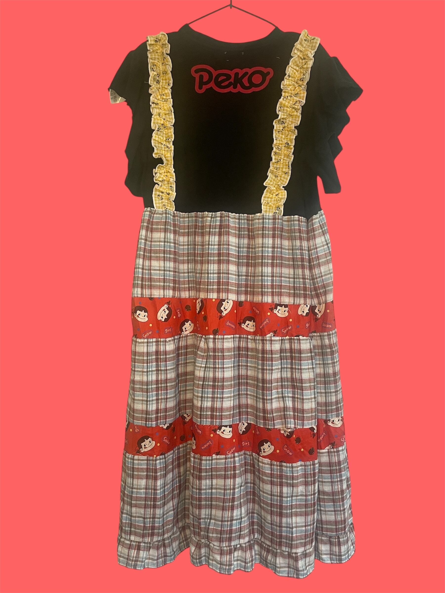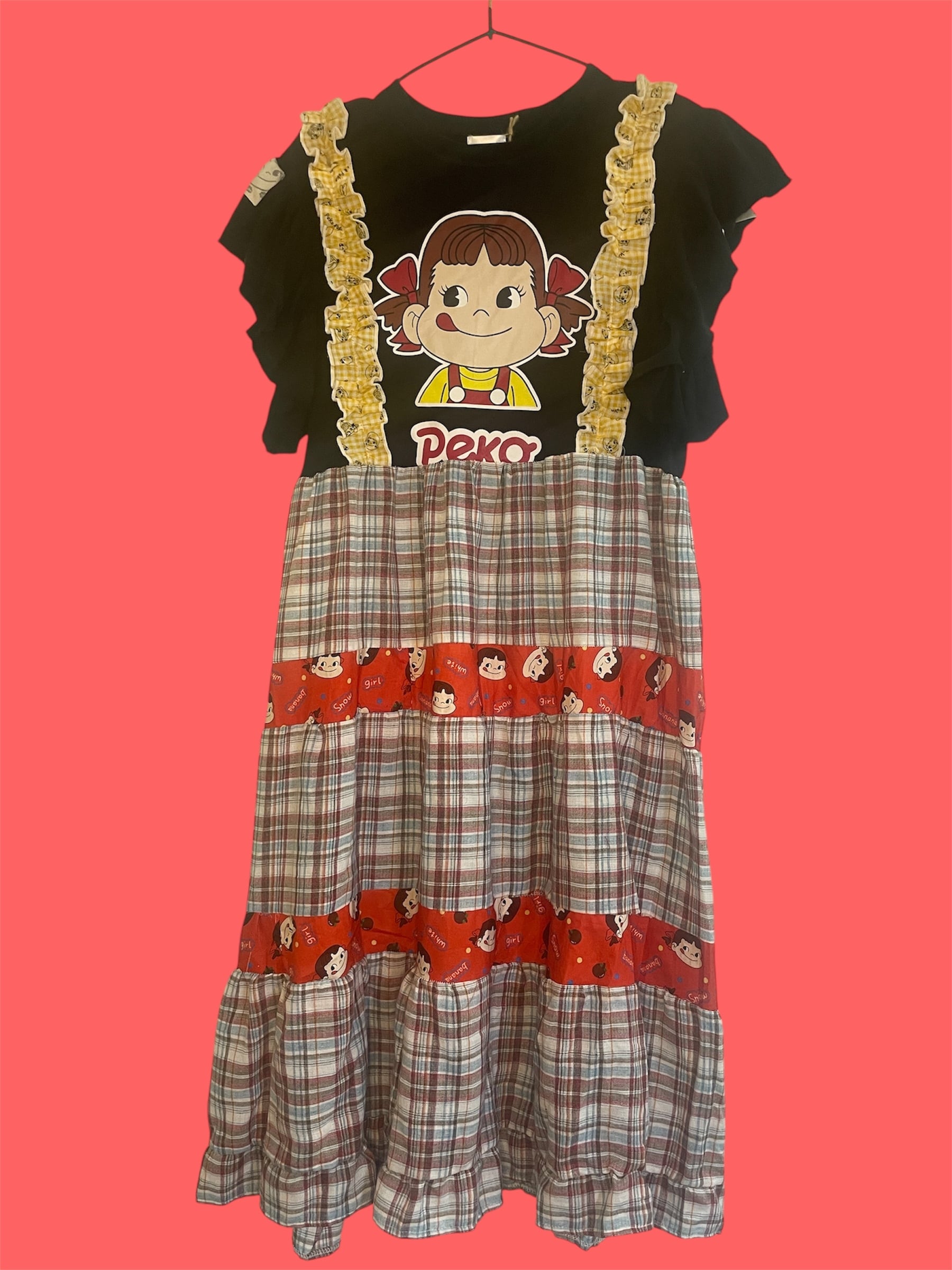 可愛らしいキャラTシャツとチェック柄が融合したデザインワンピース