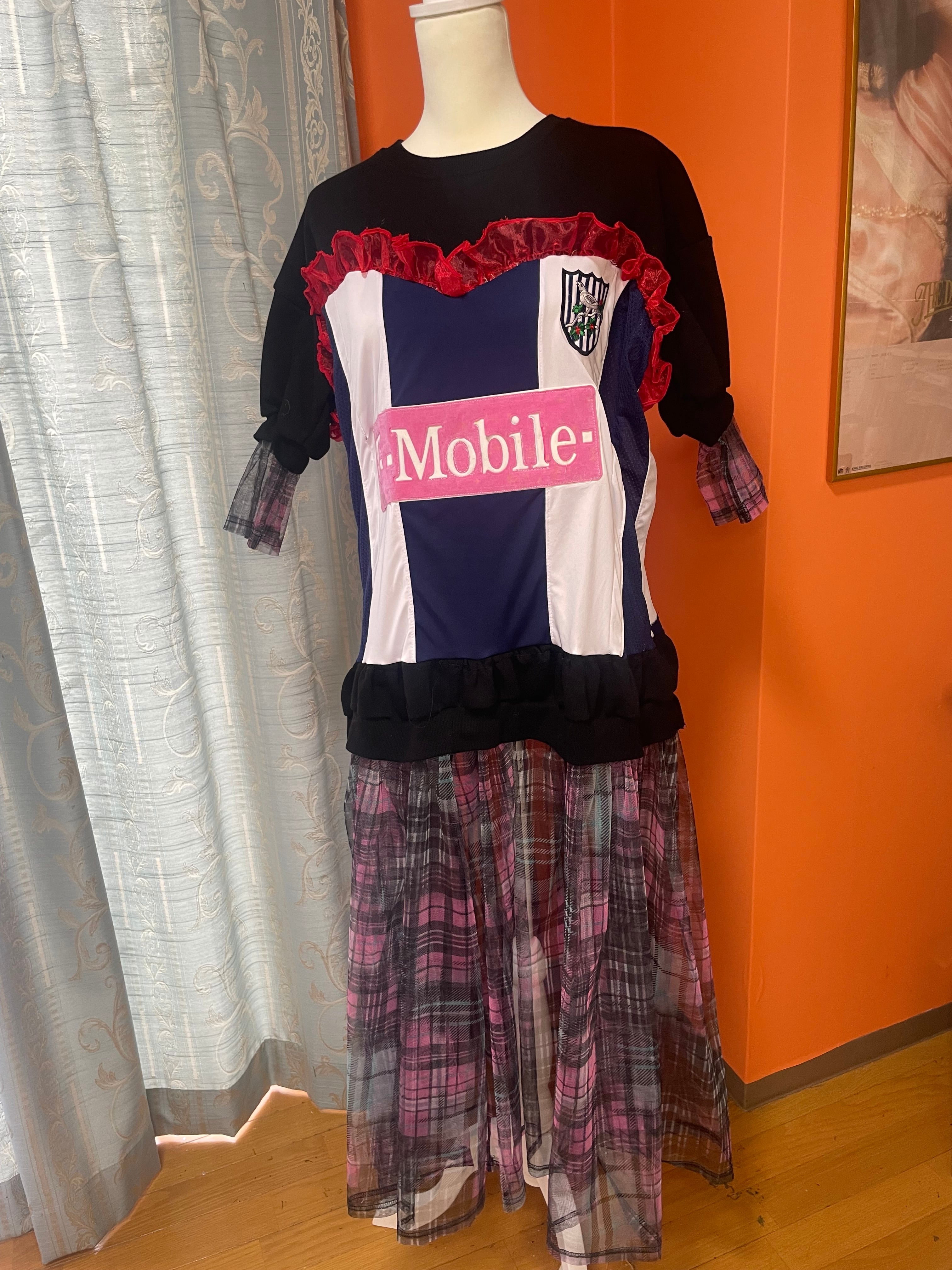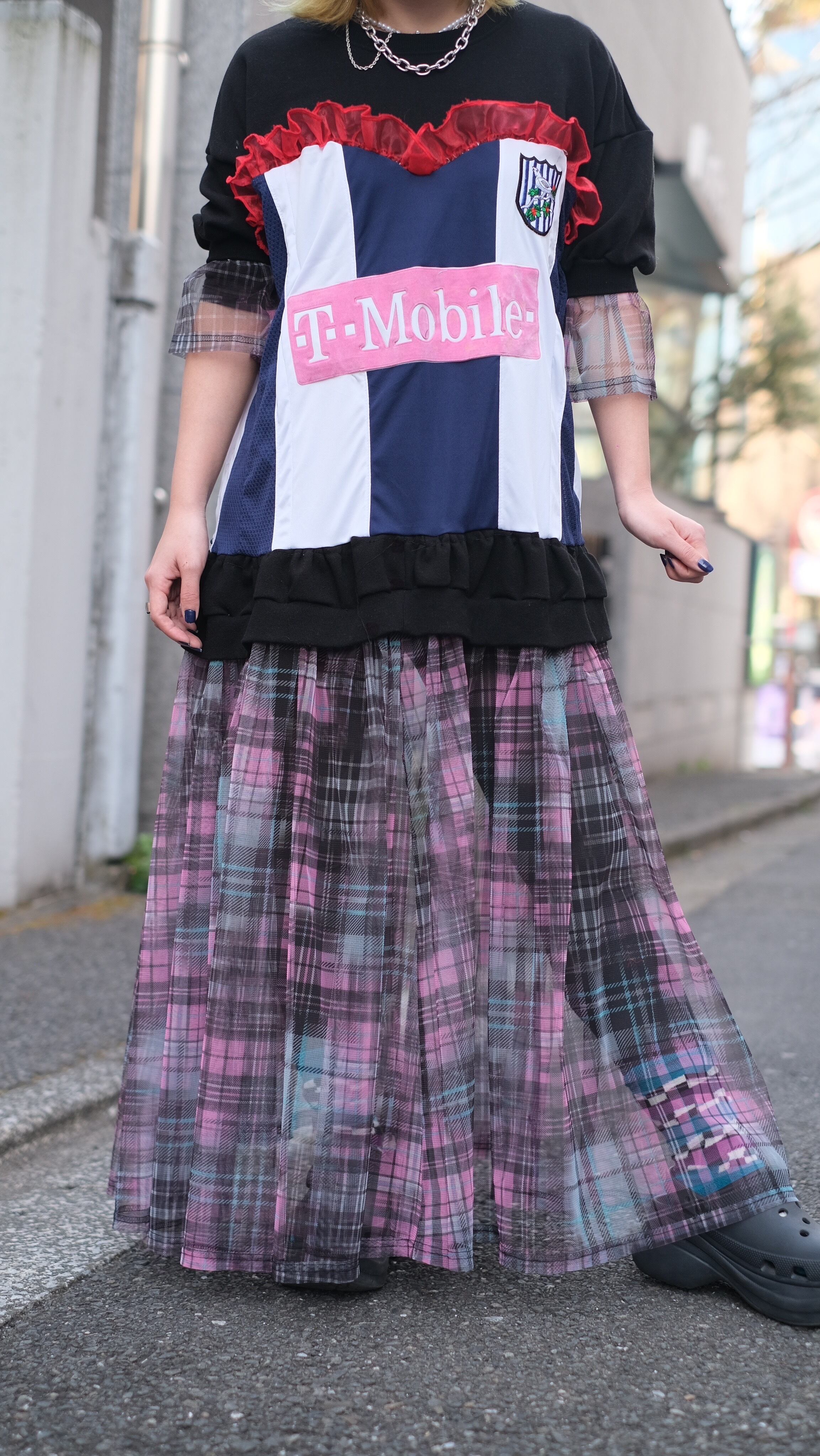 ユニフォームとトレーナーを大胆にドッキングし、タータンチェックのシースルースカートを組み合わせた個性的なロングワンピース。スポーティーなエッセンスを取り入れつつ、チュールの透け感が女性らしさを引き立てる、唯一無二のリメイクアイテム