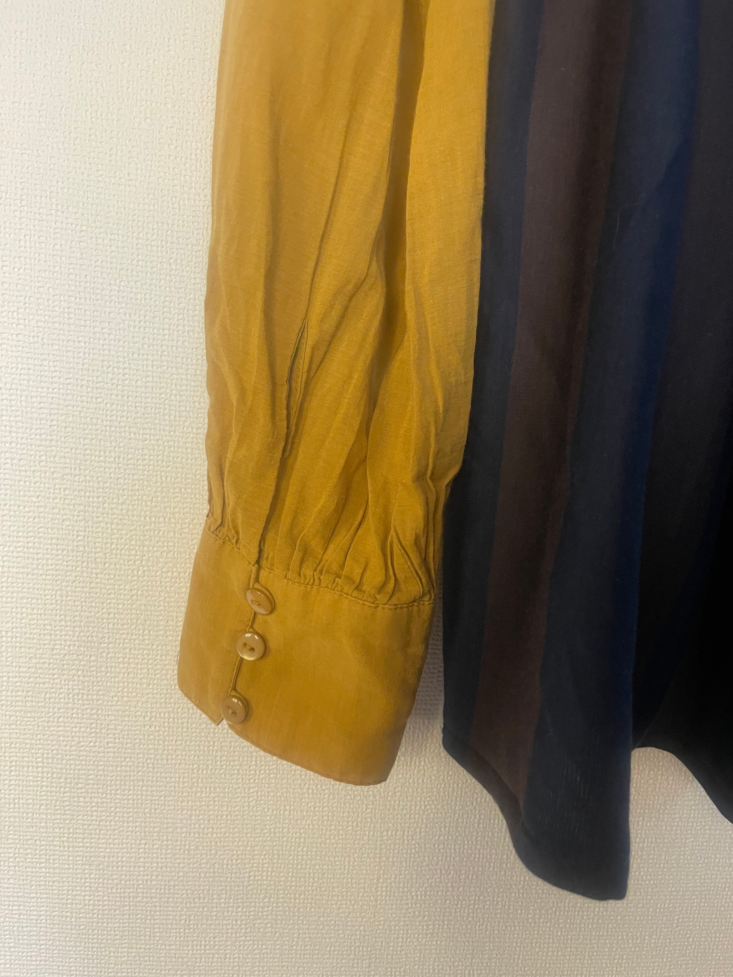 ✔ ブラウス × ボーダー生地の異素材MIX:華やかなブラウスとカジュアルなボーダー生地が絶妙に組み合わさり、他にはないスタイルが完成。