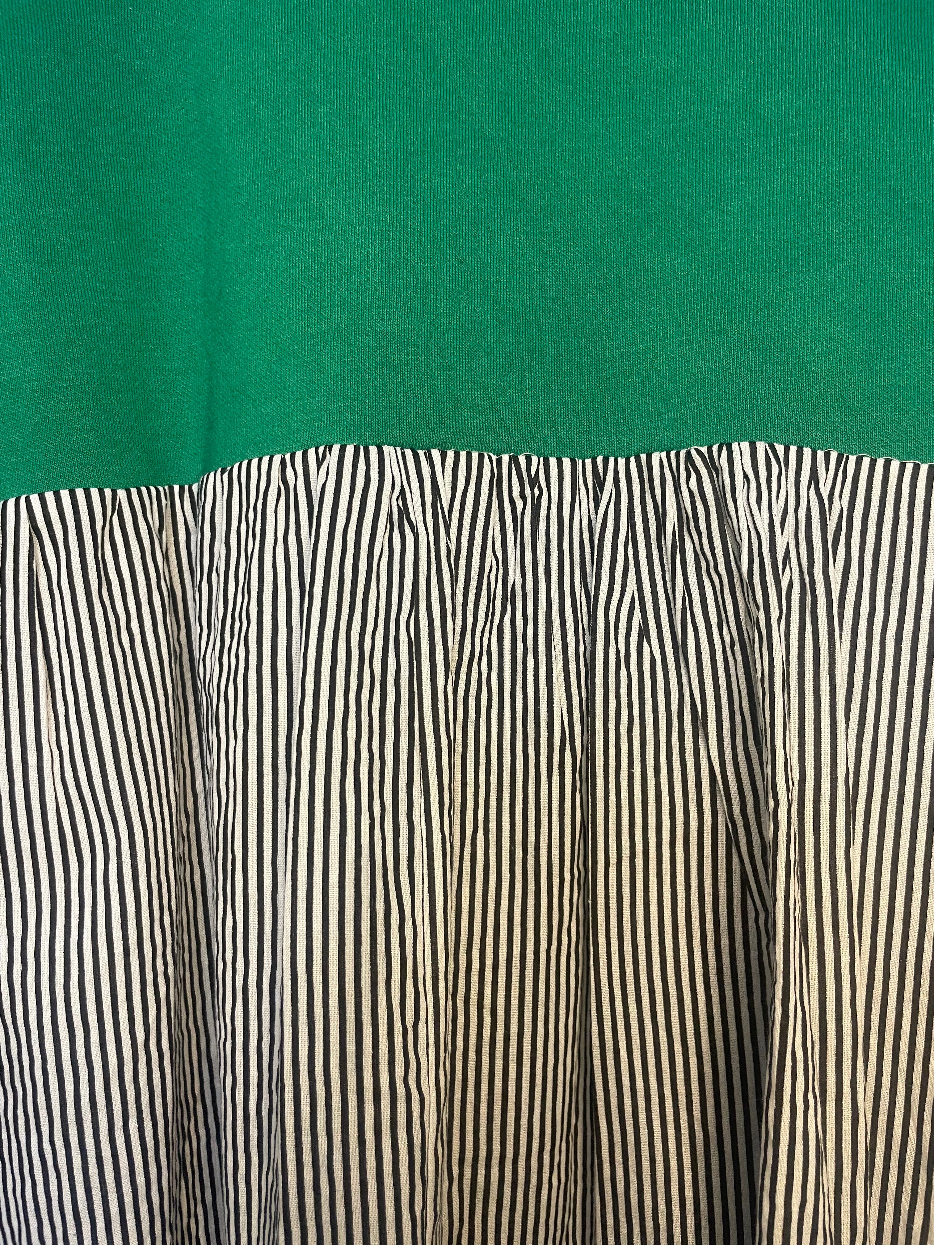 古着のトレーナーと新品のボーダー生地をギャザー状に縫い合わせました。