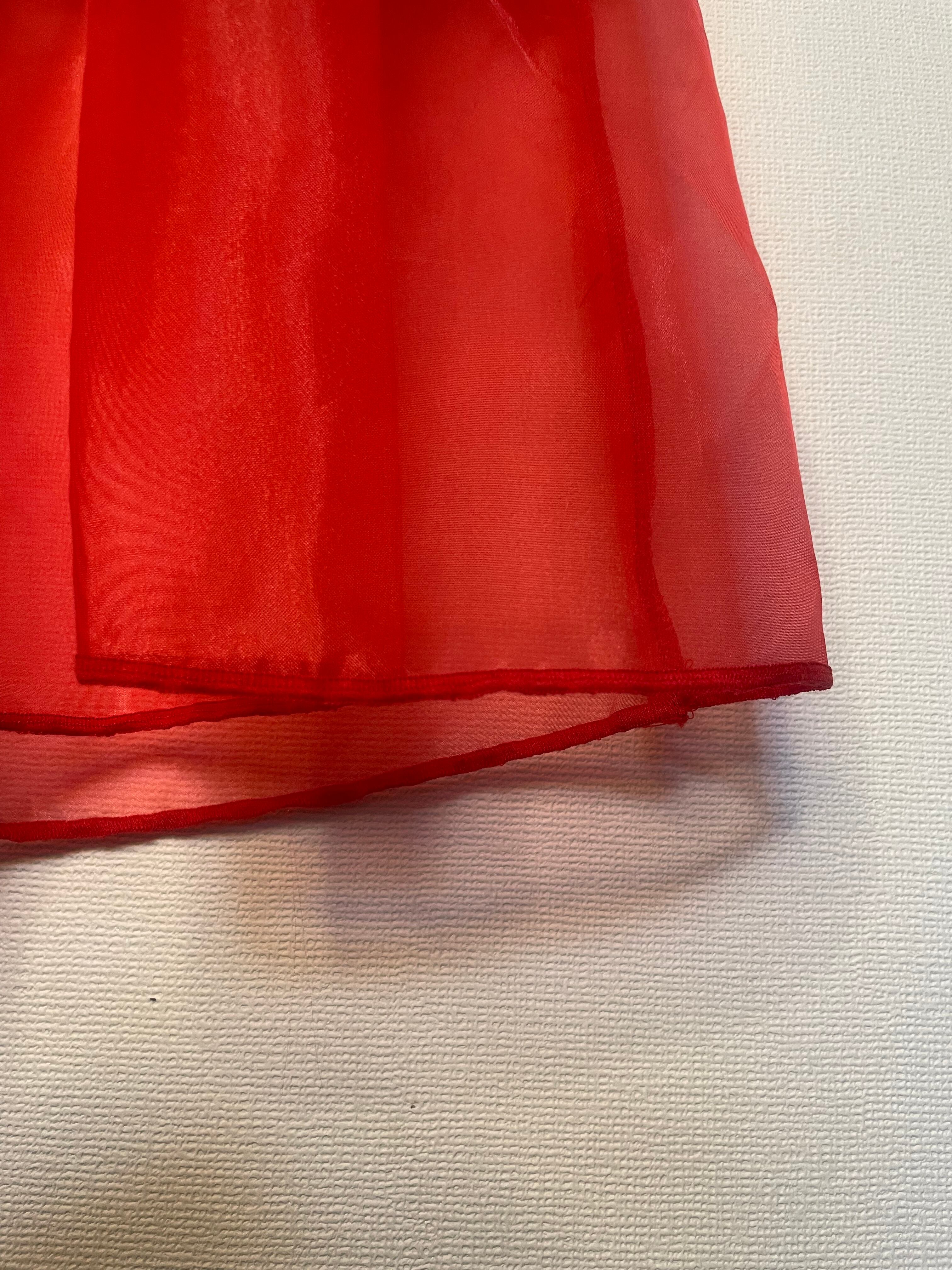チェック柄のフリルがアクセントになり、裾には透け感のあるオーガンジーを使用し、歩くたびにふわりと揺れる軽やかさ。