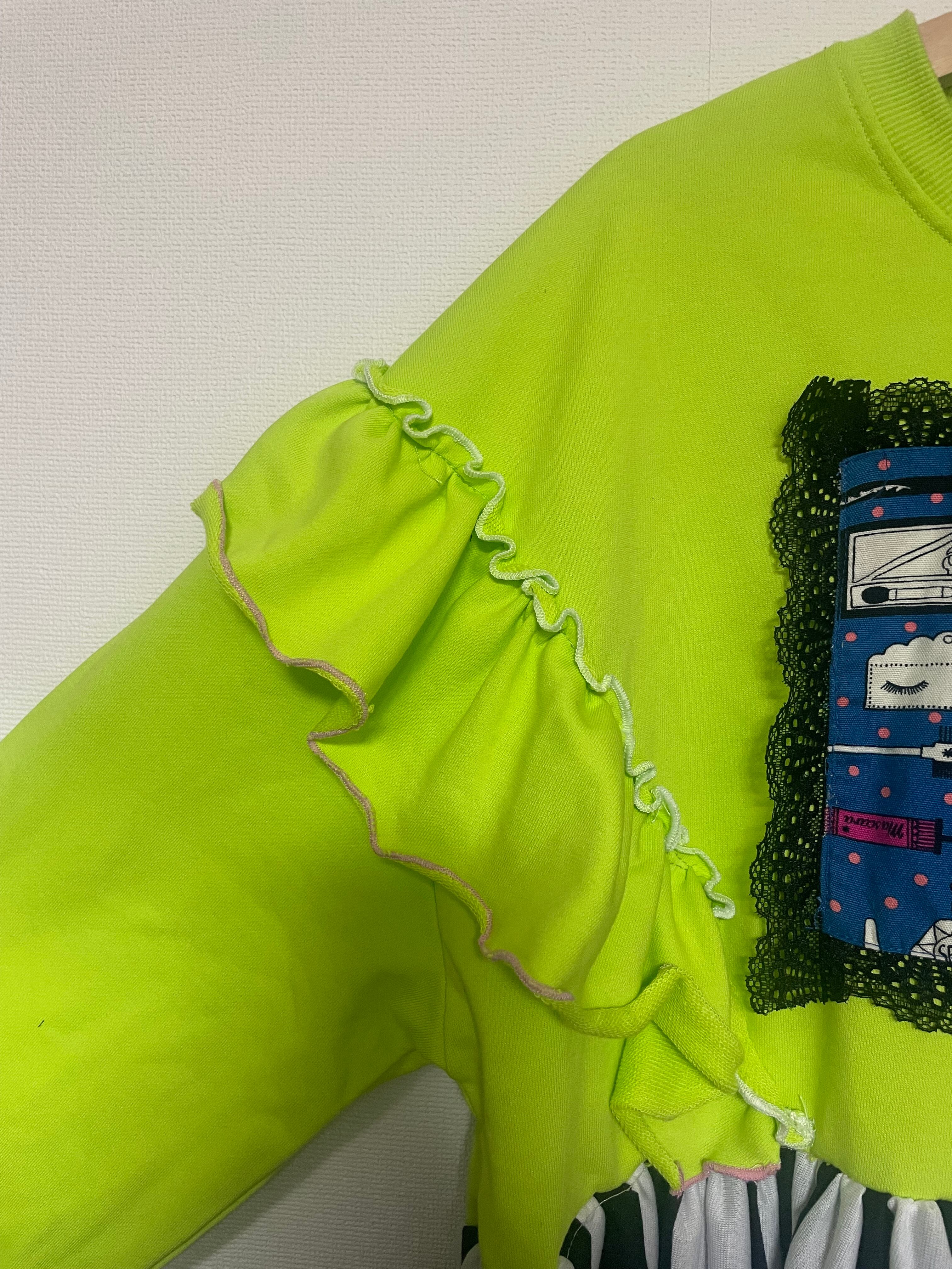 トレーナーのフロントにレトロなコスメ柄コットン生地をあしらい