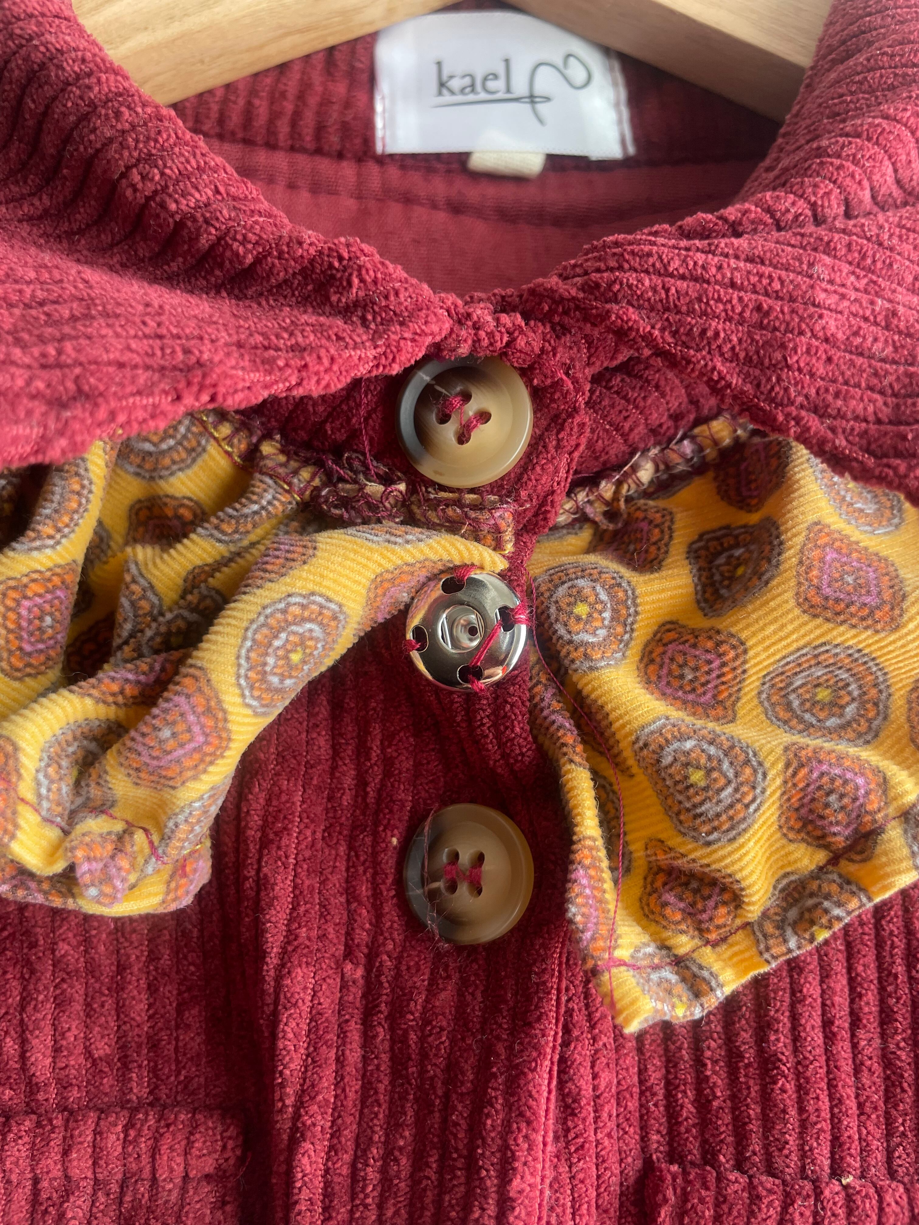 深みのある赤のコーデュロイをベースに、