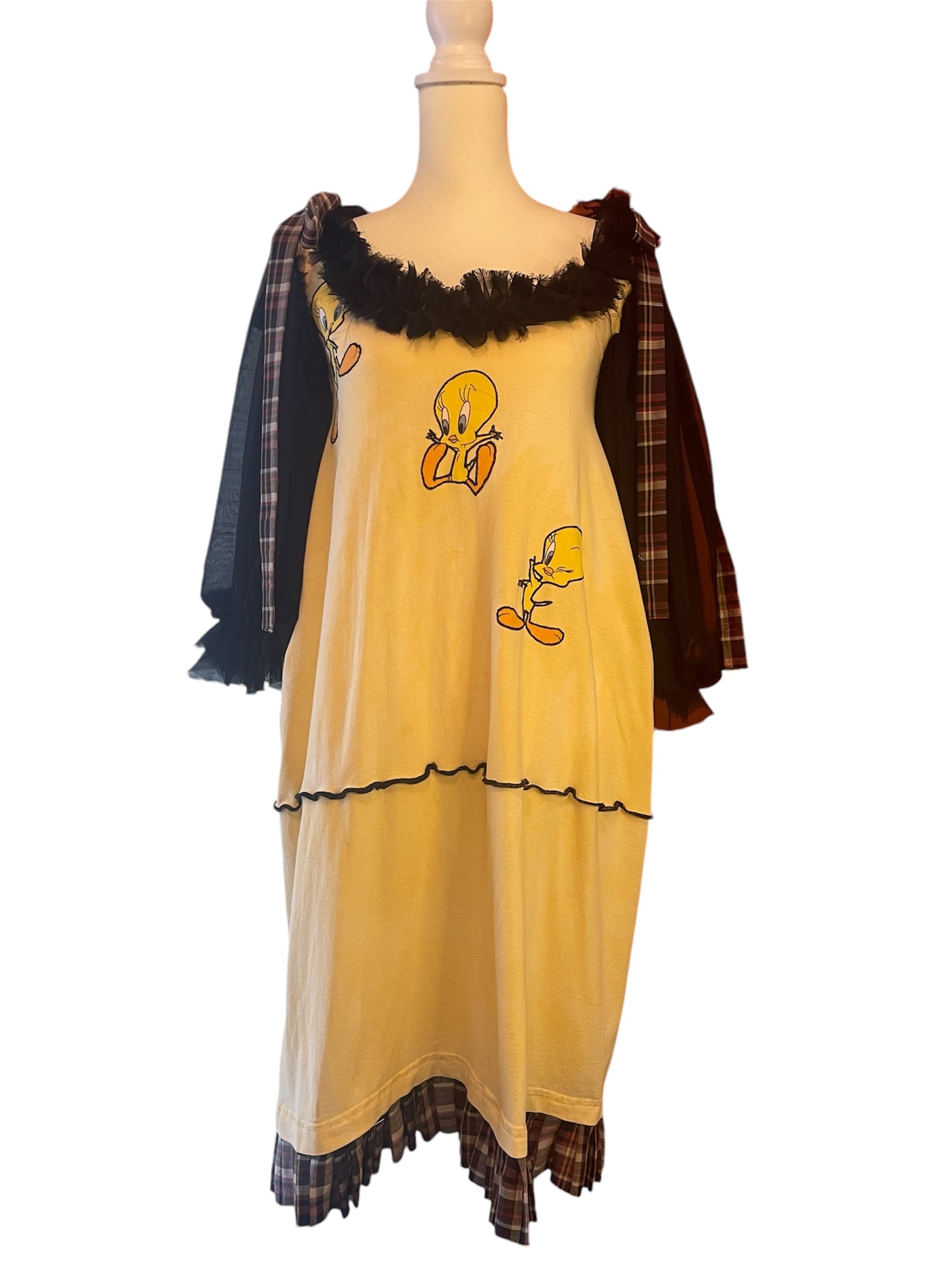 上品なプリーツ裾とタータンチェックのシックなショルダーリボンがポイントで、女性らしい表情とキャラクターの遊び心を演出します。