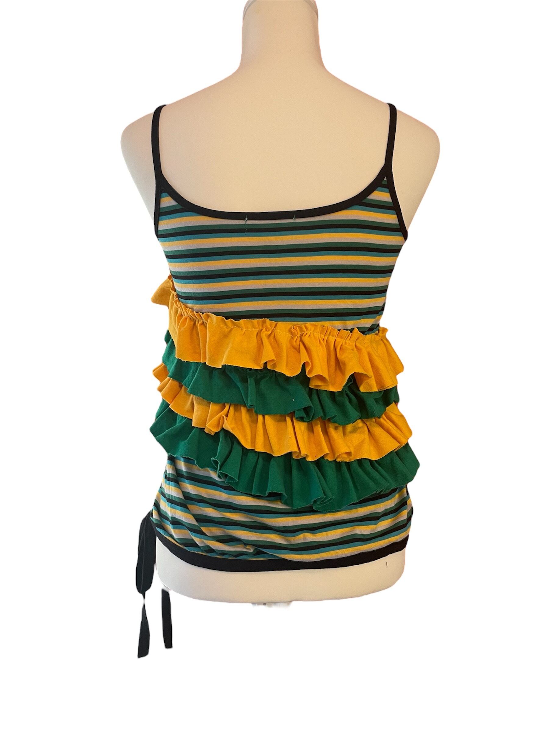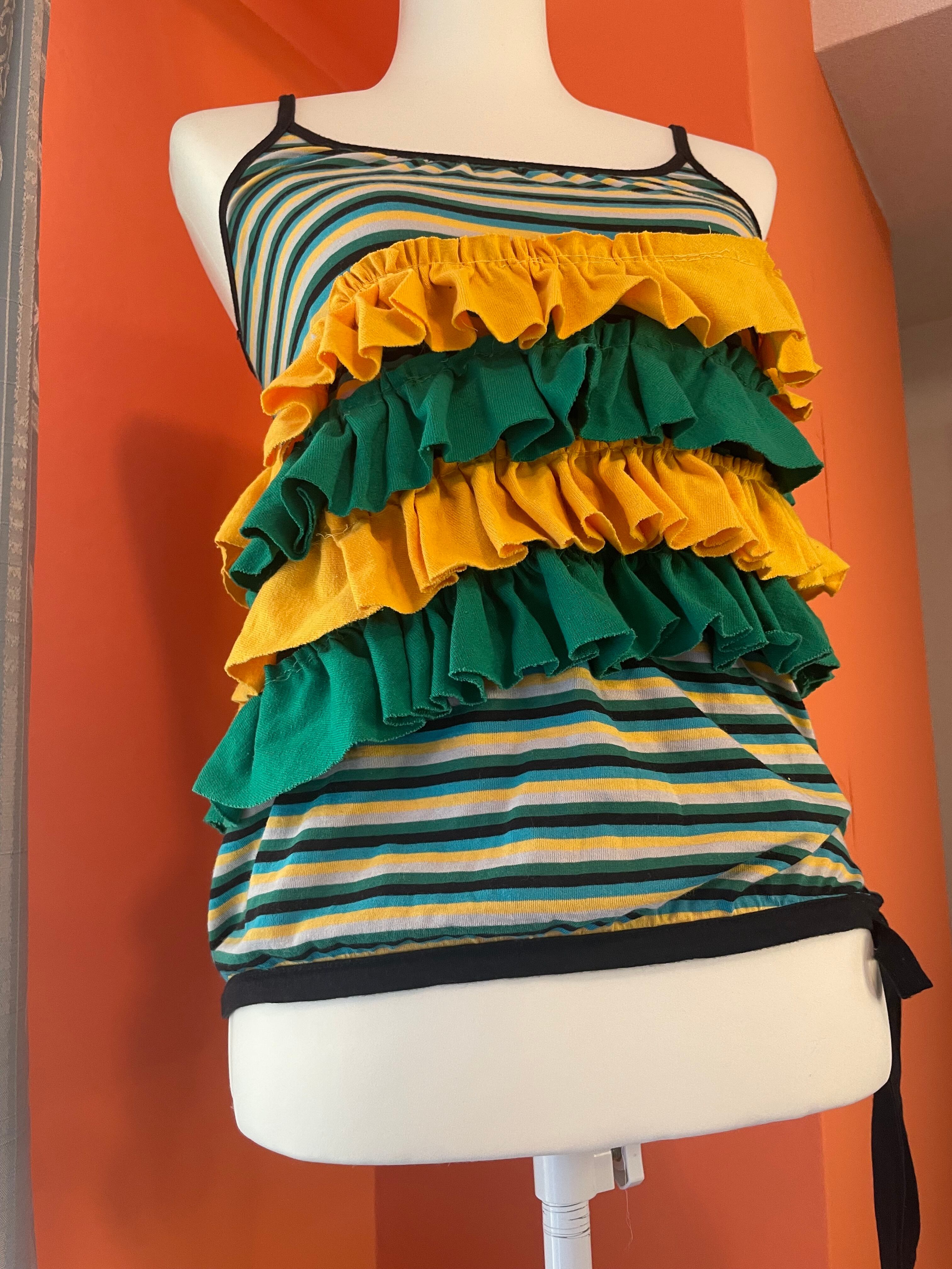 鮮やかなグリーンとイエローを組み合わせた斜めフリルの遊び心がアクセントに