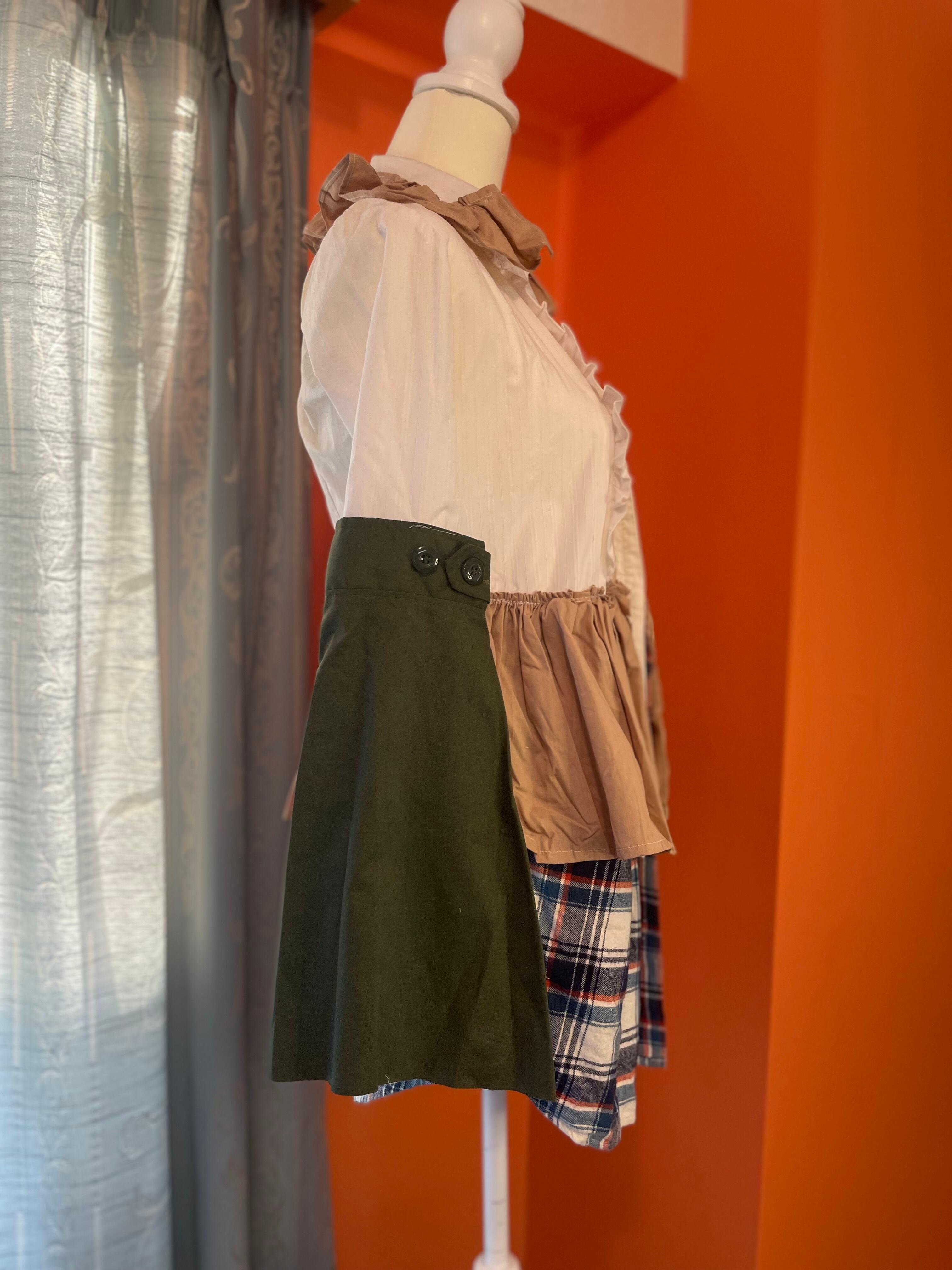 レタストリムと呼ばれる縦の細かいラインデザインが全体を引き締めつつも、首元や袖口にはフリルがあしらわれているので、女性らしい柔らかさも演出します。