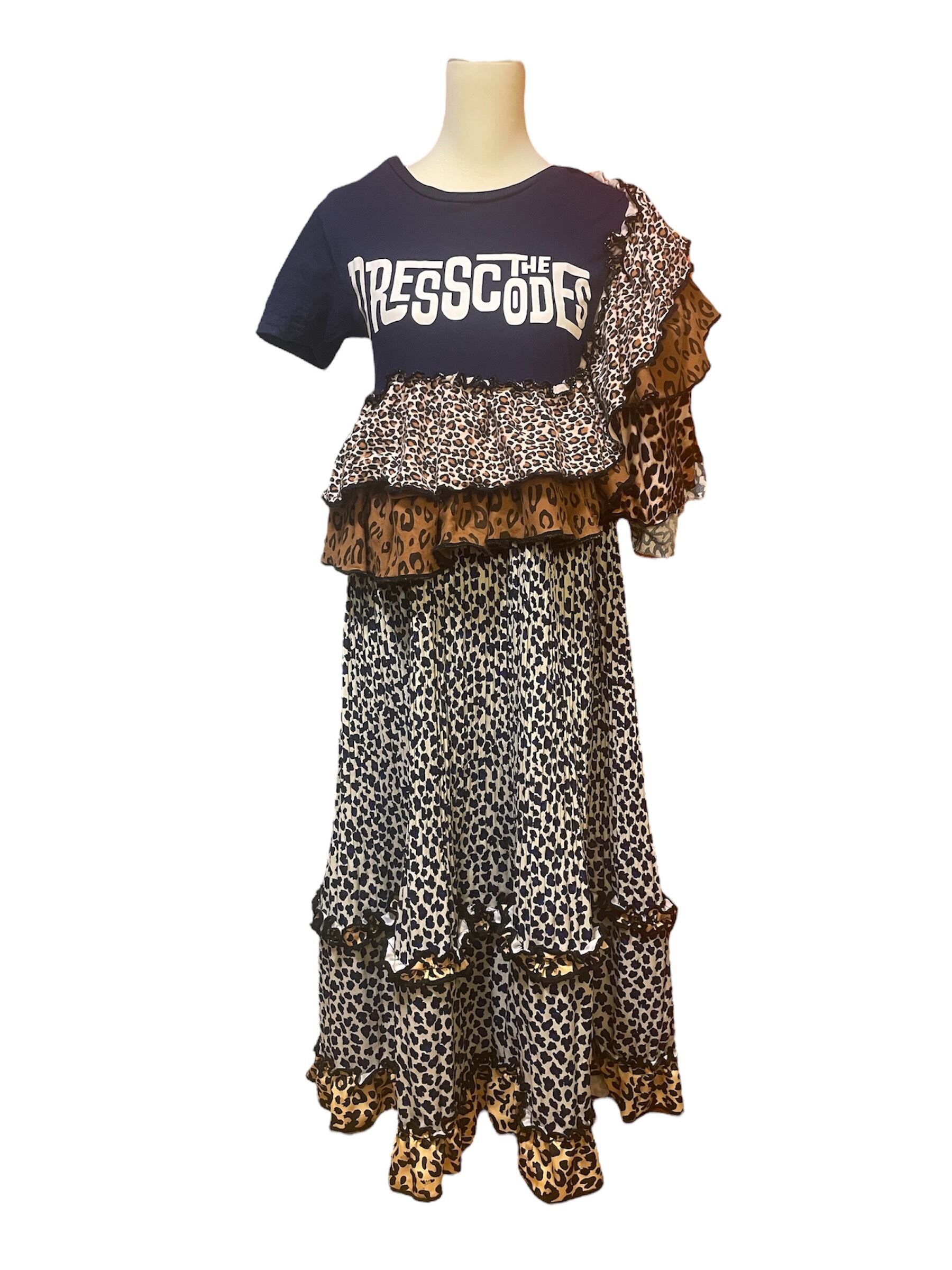 バンドTシャツに5種類の豹柄を組み合わせた、ロングフリルワンピースです。